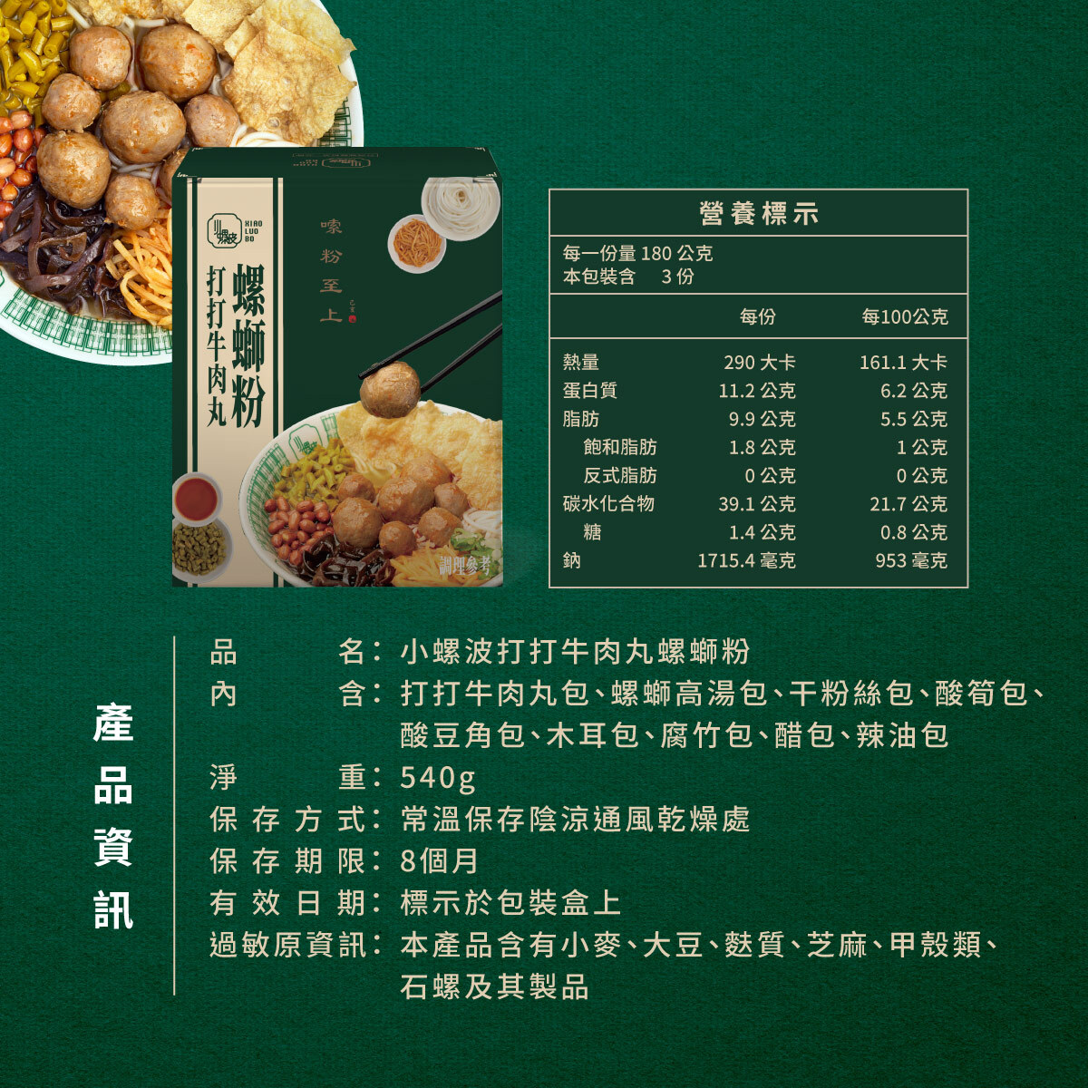 小螺波打打牛肉丸:牛肉丸[牛肉(巴拉圭)、糖、鹽、磷酸二澱粉(黏稠劑)、L-麩酸鈉、調味料(胺基乙酸、DL-胺基丙酸、5'-次黃嘌呤核苷磷酸二鈉、5'-鳥嘌呤核苷磷酸二鈉)、結著劑(多磷酸鈉、焦磷酸鈉、偏磷酸鉀、偏磷酸鈉)]、水、豬油(台灣)、薑片、牛精粉[食鹽、香料、L-麩酸鈉、牛脂、糖、白胡椒粉、焦糖色素、二氧化矽、調味劑(5'-次黃嘌呤核苷磷酸二鈉、5'-鳥嘌呤核苷磷酸二鈉)]、紅花椒粒、L-麩酸鈉、八角、鹽、小茴香。內容量130克/包(固型量110克)。