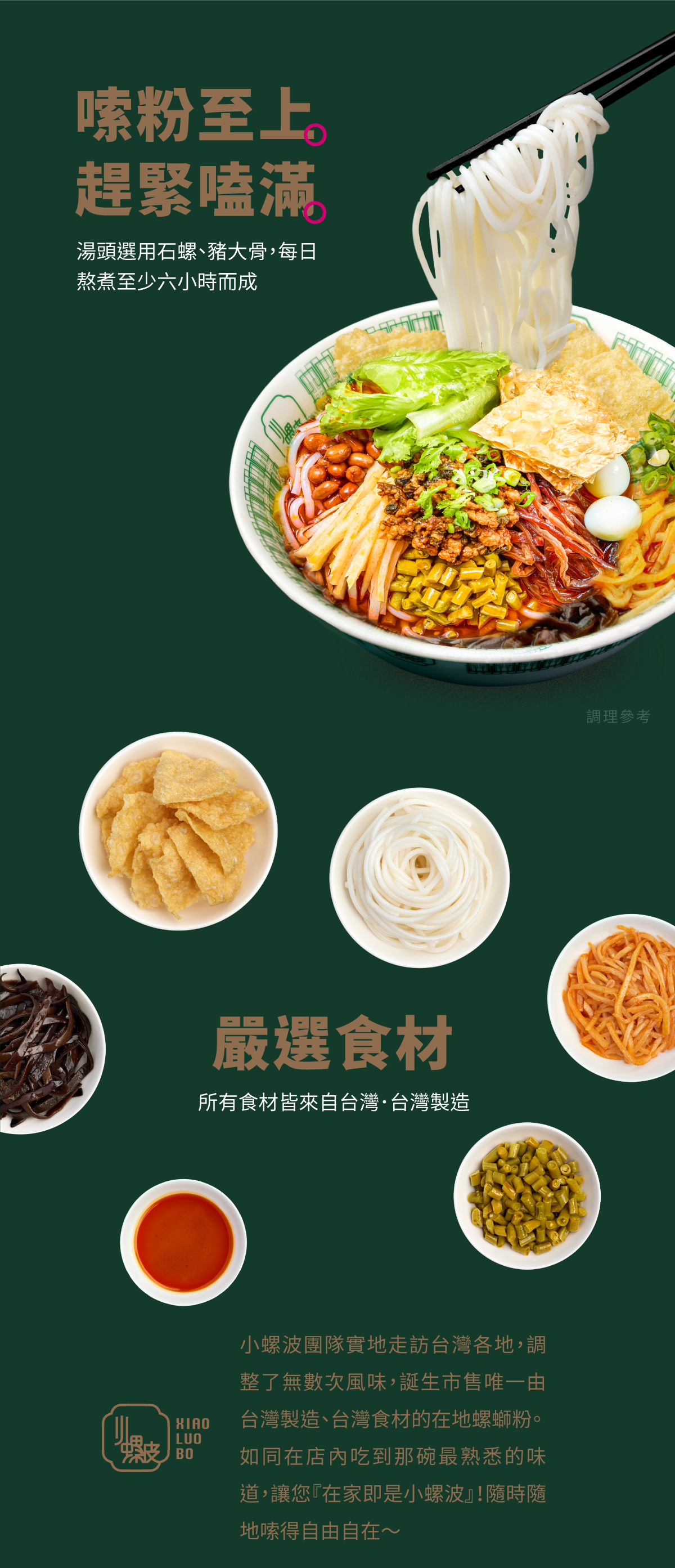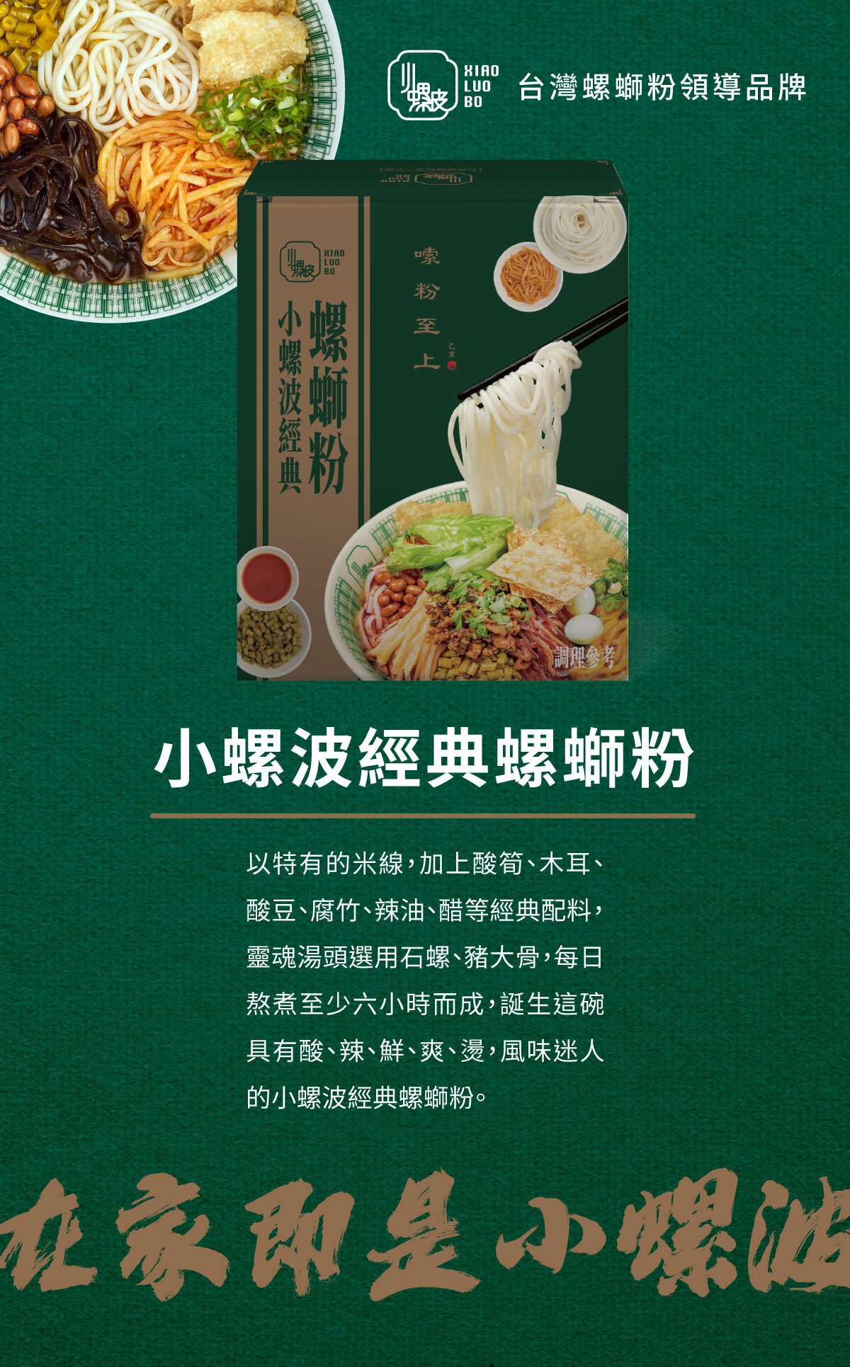 嗦粉至上,趕緊嗑滿!以特有的米線,加上酸筍、木耳、酸豆、腐竹、辣油、醋等經典配料,靈魂湯頭選用石螺、豬大骨,每日熬煮至少六小時而成,誕生這碗具有酸、辣、鮮、爽、燙,風味迷人的小螺波經典螺螄粉。