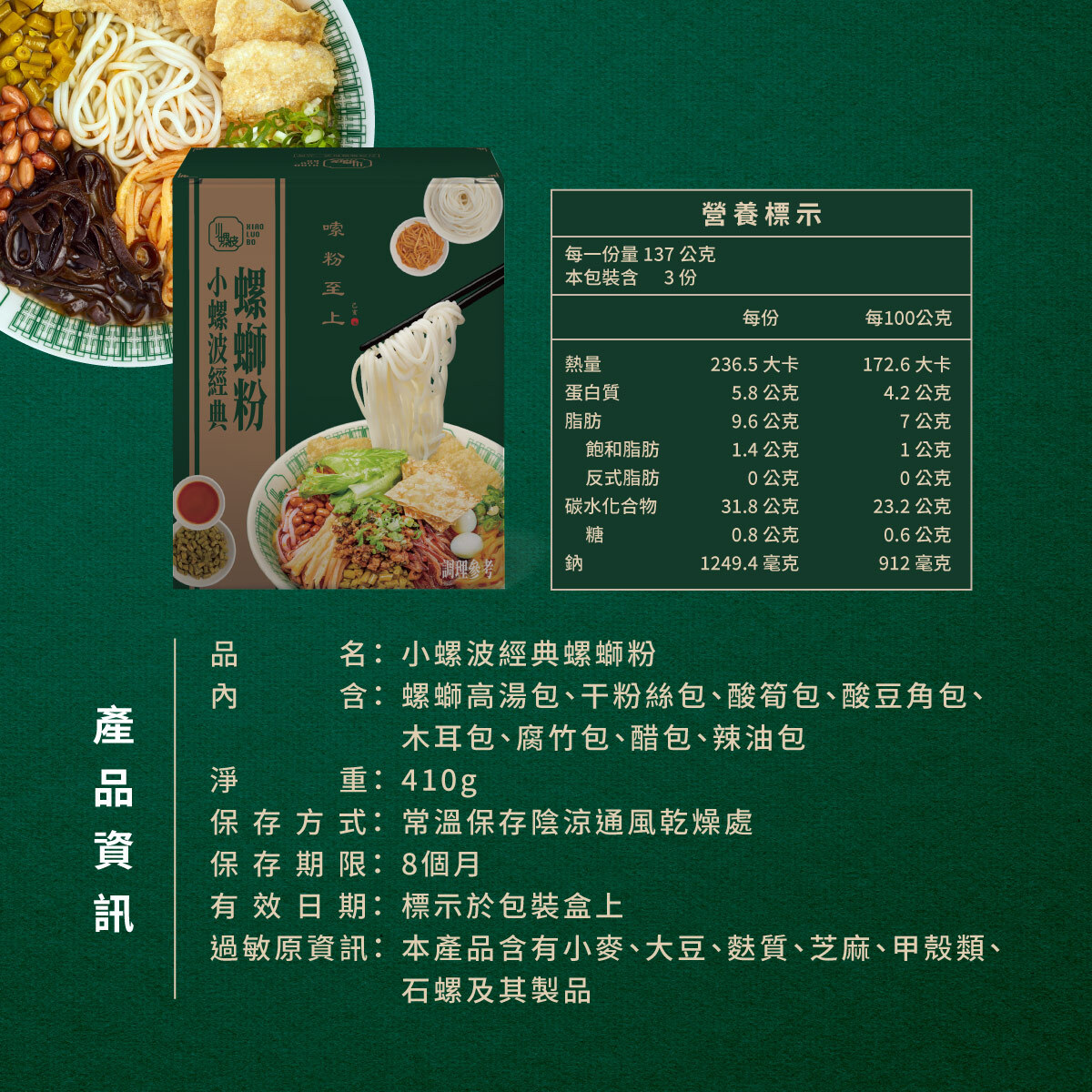 內容物:經典螺螄粉*2、麻辣臭臭豆腐主餐包*1、麻辣香香鴨血主餐包*2、匠人手工鹹檸檬*1、干粉絲*3、腐竹*3